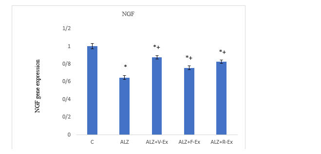Methods: Thirty male C57BL/6 mice weighing between 250-280 grams and aged over 15 months (elderly) were randomly divided into 5 groups: 1. Control, 2. Alzheimer’s disease (ALZ), 3. Voluntary training (ALZ+V-Ex), 4. Forced training (ALZ+F-Ex), and 5. Resistance training (ALZ+R-Ex). The training groups underwent their respective exercises for eight weeks, five days per week. The expression of BDNF and NGF genes was evaluated using Real-Time Polymerase Chain Reaction (PCR). Data were analyzed using one-way ANOVA and Tukey’s post hoc test with a significance level of p < 0.05.